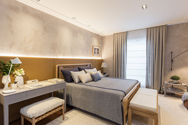 CURITIBA – PAULA MAGNANI: Um quarto de um empresário sênior, inspirado na cidade de Curitiba. Uma paleta de cores cinza que aquece o ambiente com tons também de bege e marrom. O mobiliário em linhas retas que compõe com a iluminação mais indireta uma linguagem modernista.