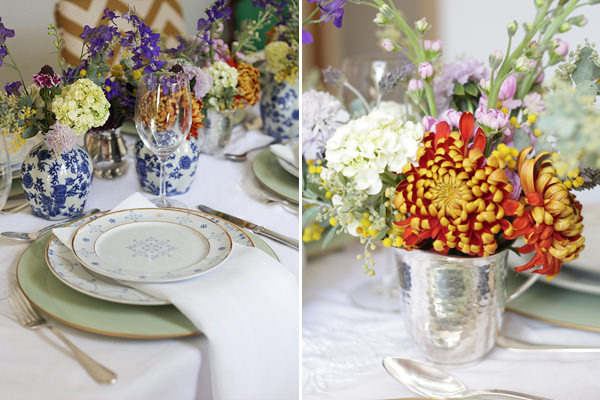 Decoração com flores, legumes e mix de pratos para um almoço em casa