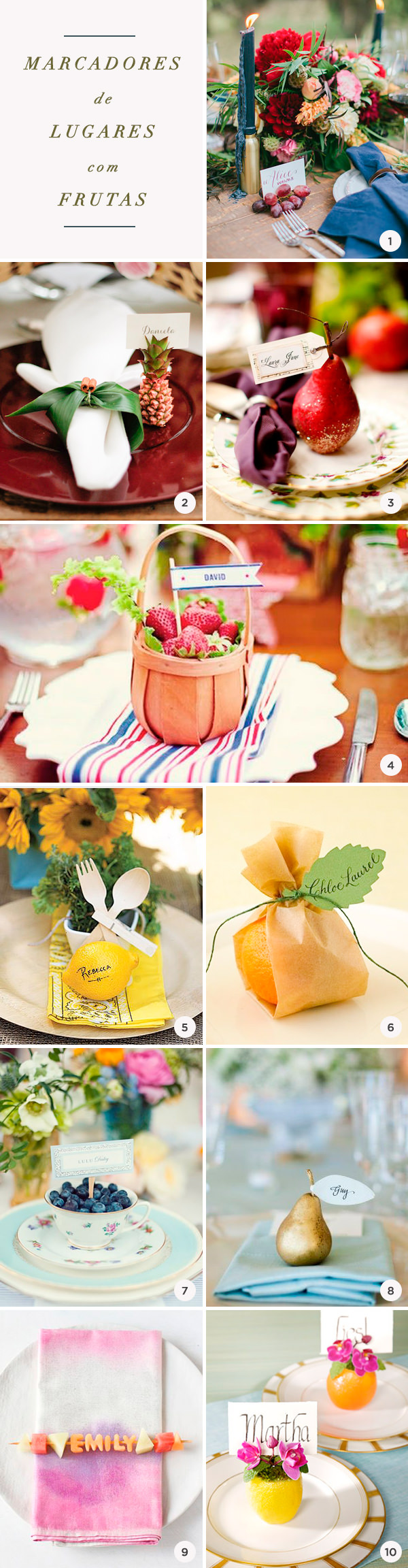 1. Preso no cacho de uva: Jen Dillender | 2. Mini abacaxi com cartão: Editorial Tropical Chic da Revista Constance Zahn nr.3 | 3. Pera vermelha com acabamento dourado: Ciao! Newport Beach | 4. Cestinha com morangos: Party Style | 5. Limão siciliano com nome escrito com caneta: Pinterest | 6. Laranja enrolada em papel craft: Martha Stewart | 7. Xícara de blueberry: Love Life Studios | 8. Pera metalizada com folha de papel: Weddings by Sasha | 9. Letras feitas com frutas: Paper & Stitch (Tem o DIY aqui) | 10. Vasinho de limão e laranja com flores: Martha Stewart
