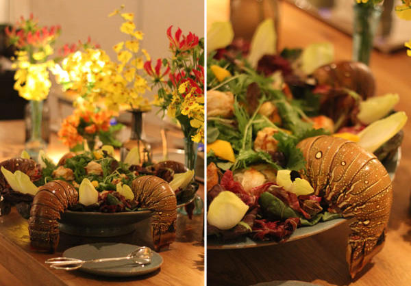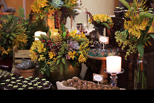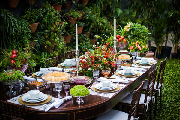 A Fabiana Moura preparou também o aparador para um chá após o almoço. Nele, chamou a atenção o grande arranjo de flores que a FP Ateliê fez dentro de um antigo e rústico escorredor de pratos da D.Filipa