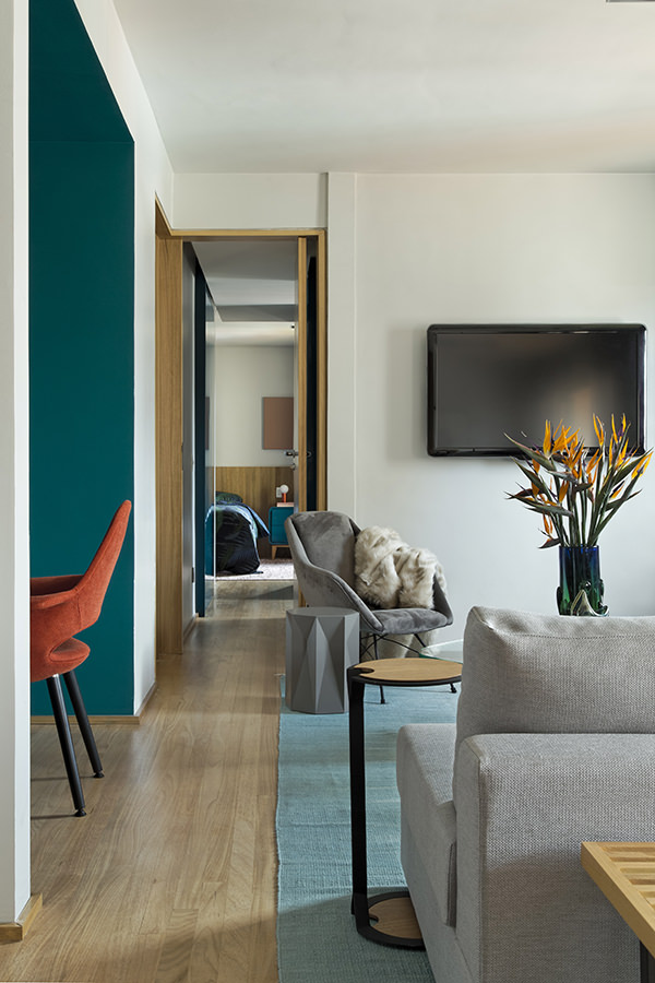 Logo no living, o destaque fica por conta da caixa azul petróleo criada para receber o home office. Integrado à sala, o espaço ainda ganhou mais cor com a cadeira Organic, de Charles e Ray Eames. O piso de madeira une todos os ambientes e se propaga pela porta de entrada e pelos armários de tauari projetados por Diego Revollo para a cozinha. Nesta, a ilha com cooktop permite ao jovem morador colocar o papo em dia com os amigos enquanto prepara o jantar.