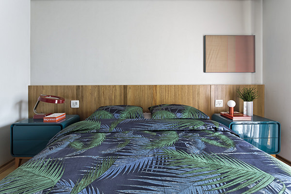 Tela sobre a cabeceira no quarto: Estela Sokol | Cabeceira e criados: Design Diego Revollo | Luminária de mesa déc 1940: Loja Teo | Vaso de porcelana: Loja Teo | Roupa de Cama: Collectania Auping | Tapete Latakia Rosse: Phenicia Concept | Banco madeira e pelo: Marche Art de Vie