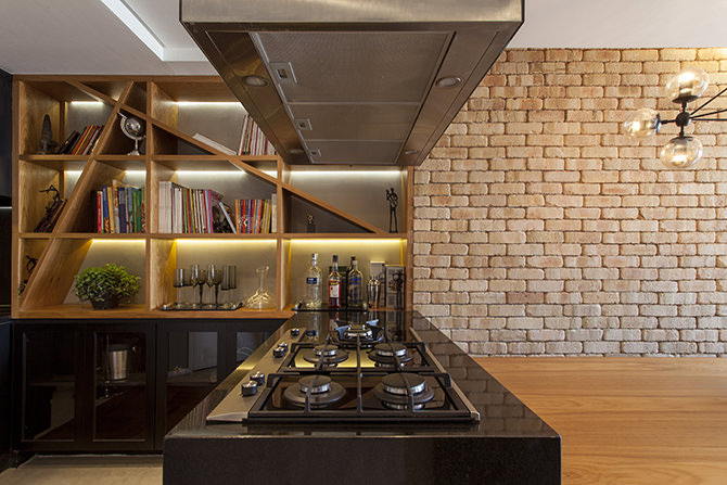 Já os profissionais do Estúdio Penha apostaram na porta pantográfica para separar e integrar, ao mesmo tempo, a varanda gourmet da sala neste apartamento. Neste caso, a pintura rústica, com cara de antiga, ficou ainda mais charmoso: