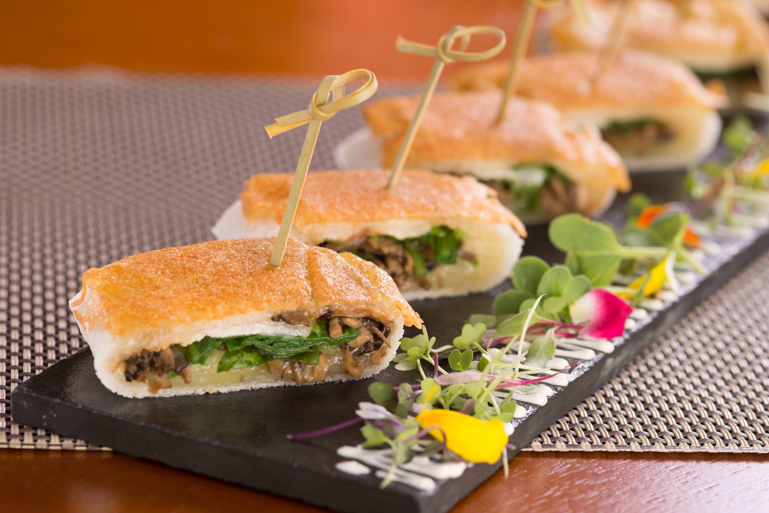 Pintxos de tapioca recheada com shimeji, requeijão do Norte e rúcula