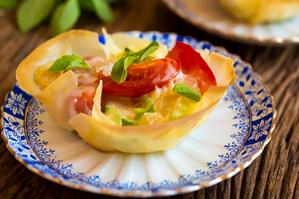 Tortinha de massa phylo com abobrinha, tomate, manjericão e taleggio