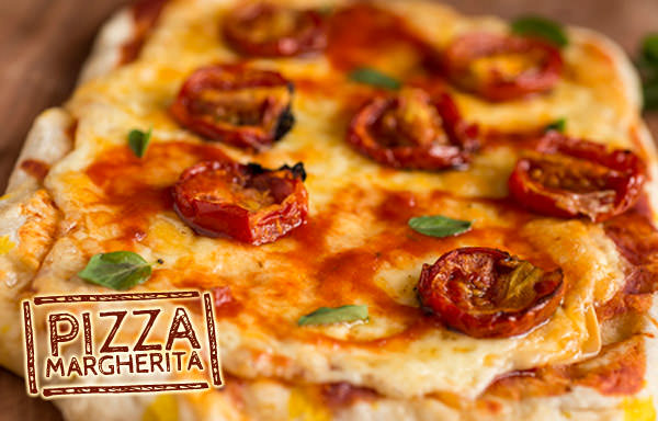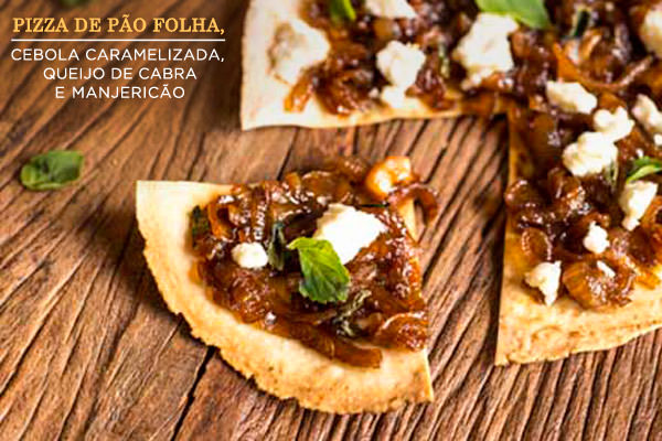 Pizza de pão folha, cebola caramelizada, queijo de cabra e manjericão