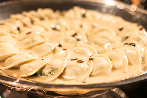 Sorrentini de mascarpone e clorofila de rúcula ao creme tartufo