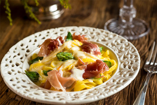 Fusili fresco com molho rústico de tomates, pancetta e brócolis