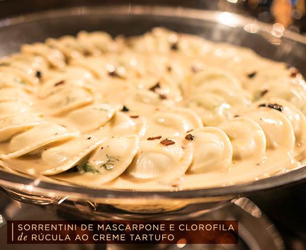 Sorrentini de mascarpone e clorofila de rúcula ao creme tartufo